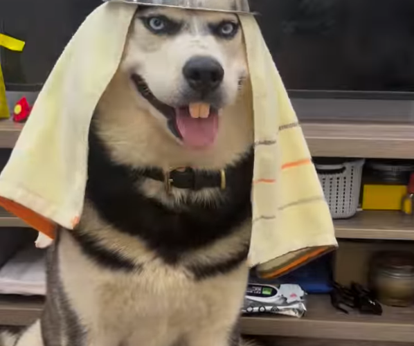 その凶悪な目つきと神秘的な笑顔を見せるハスキー犬の姿は、まさに愛らしさと面白さが絶妙に融合した瞬間です。まるで何かいたずらを企んでいるかのような表情を浮かべ、このハスキー犬はまるでコミックのキャラクターのようです。